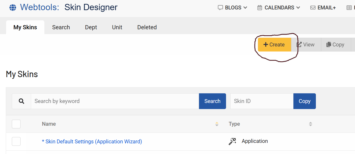 Once you are in the Skin Designer webtool, click the yellow +Create button in the top middle of the screen to open the Create a New Skin menu.