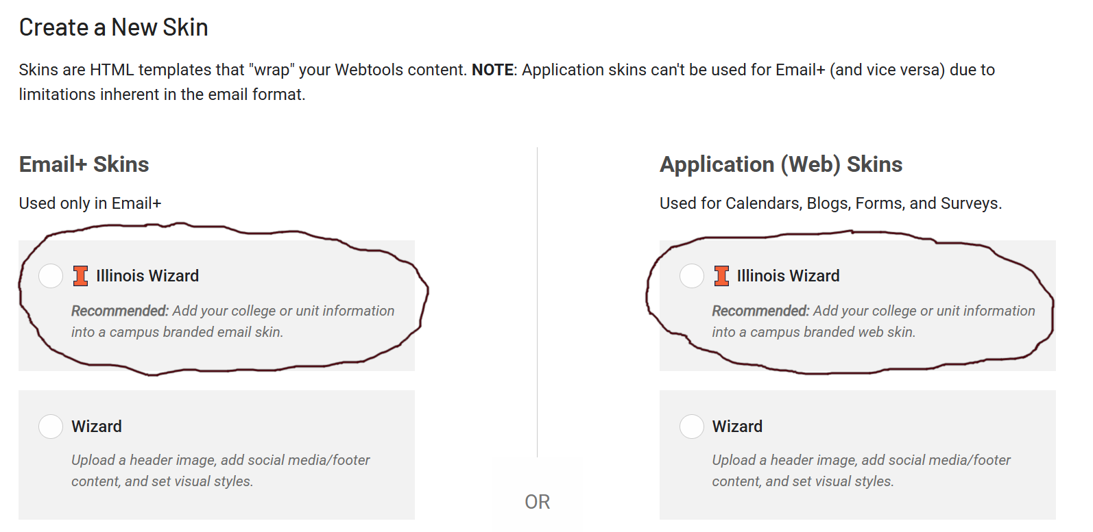 You have the choice to create an Email+ or an Application skin. To make a branded U. of I. or Illinois skin, click either the Illinois Wizard options under either the Email+ Skins or Application Skins column.