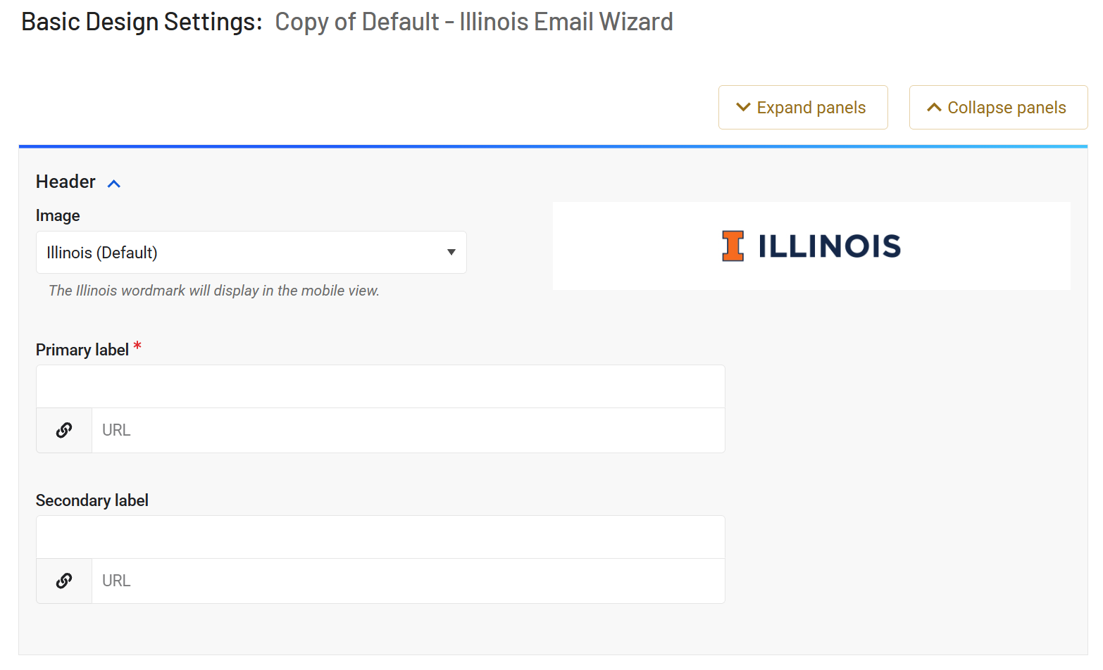 Next, you will see the Basic Design Settings. Under the Header section, you are able to type the name of of your unit/department/program/school under the Primary label. There is a space under the Primary label to add a URL to your area's website.