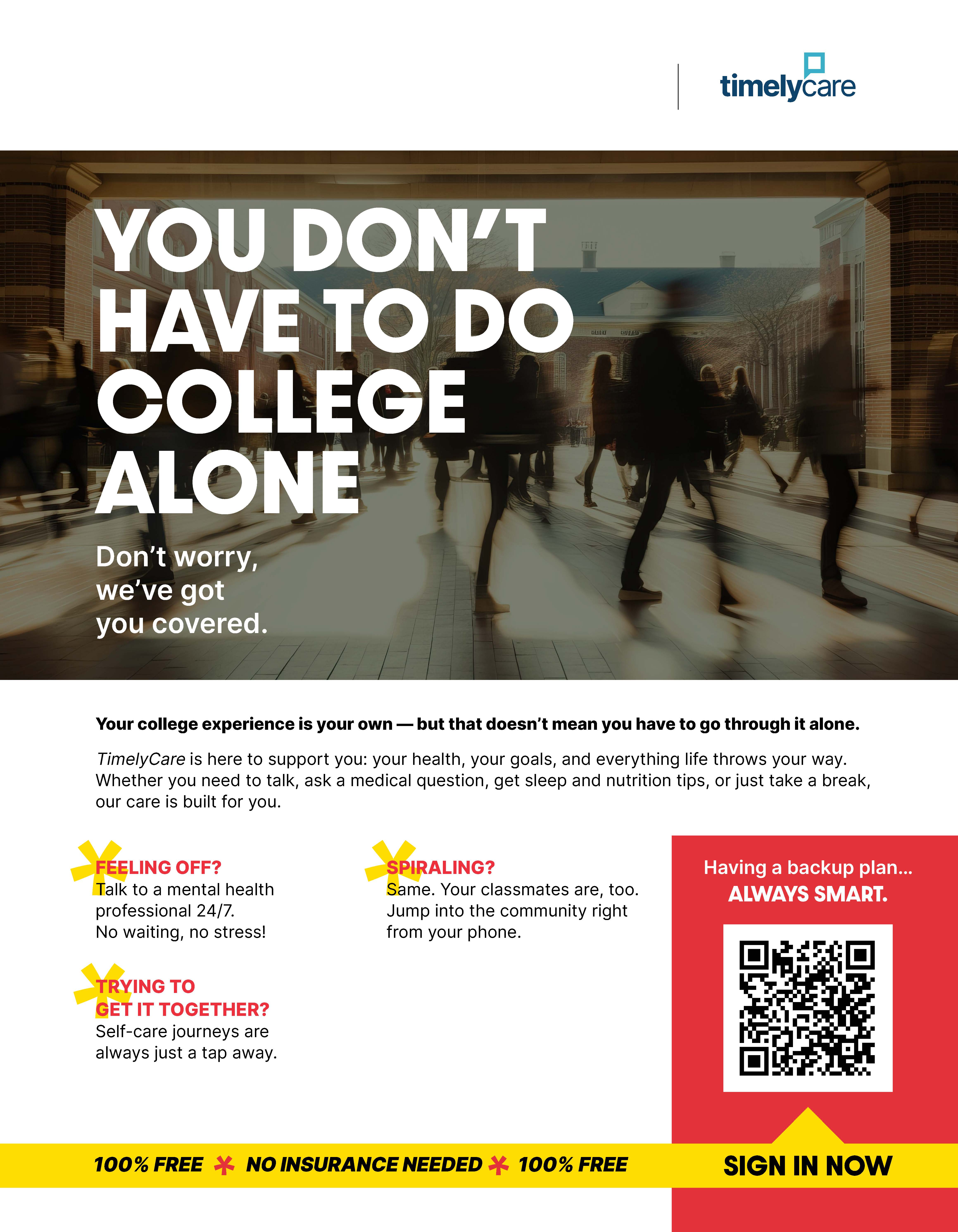 Whether students require medical care or mental health support, TimelyCare's Virtual Clinic offers on-demand care and scheduled appointments with a trusted network of experienced providers. Whether you need to talk, ask a medical question, get sleep and nutrition tips, or just take a break, our care is built for you.