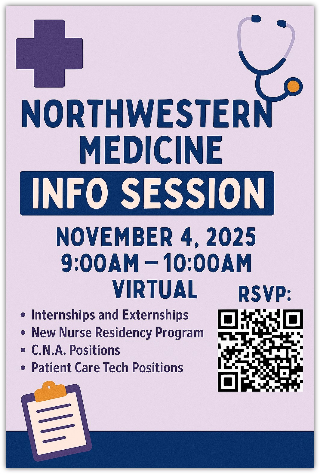 blog posts Virtual Career Event: Northwestern Medicine Info Session #2 (11/14, 12-12:30 PM) CareerVirtual Events Images Event: Northwestern Medicine Info Session*Session will not be recorded*Date: November 14, 2025Time: 12:00pm-12:30pmLocation: VirtualRSVP: https://uic.ca1.qualtrics.com/jfe/form/SV_81Whf2XRIwIcDBA