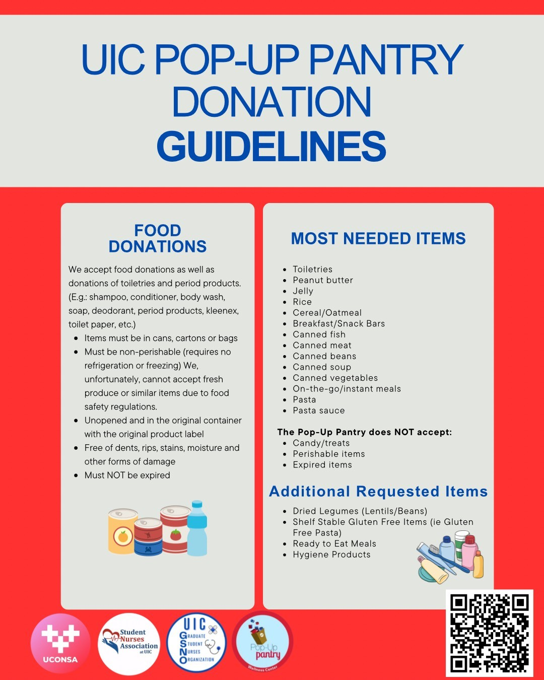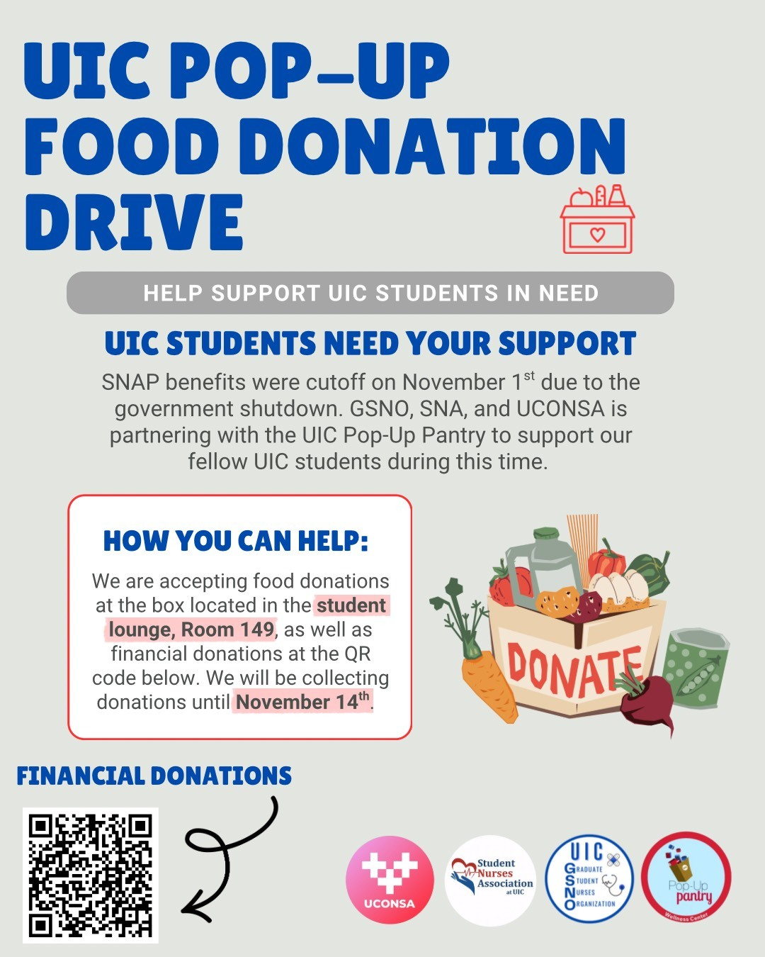 Together, GSNO, UCONSA, and SNA are hosting a food drive at the College of Nursing to meet this urgent need. All donations will go to the UIC Pop-Up Pantry to provide meals to UIC students in need. A dropbox for nonperishable food and hygiene donations will be in the CON student lounge (Room 149) until November 14th, and financial donations can be made directly to the pop-up pantry here. See the attached flyers for donation guidelines and a list of requested items.