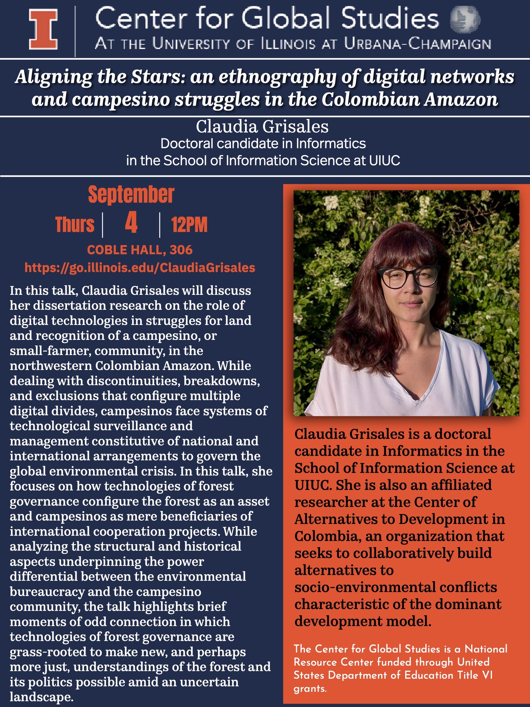 September 4 – Claudia Grisales Bohorquez (PhD candidate, UIUC), "Aligning the Stars: an Ethnography of Digital Networks and Campesino Struggles in the Colombian Amazon."
