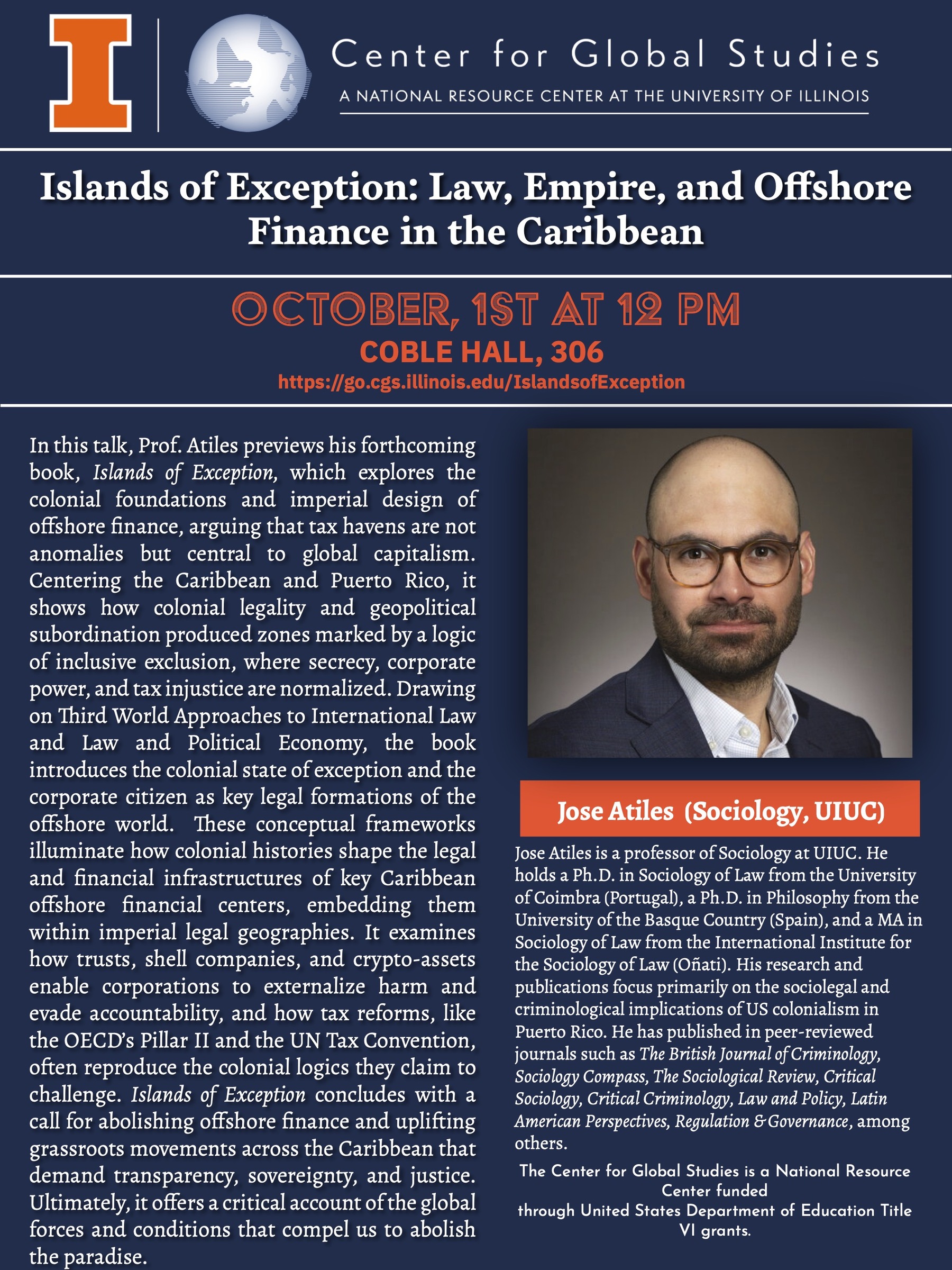 October 1 – Jose Atiles (Sociology, UIUC), “Islands of Exception: Law, Empire, and Offshore Finance in the Caribbean.”
