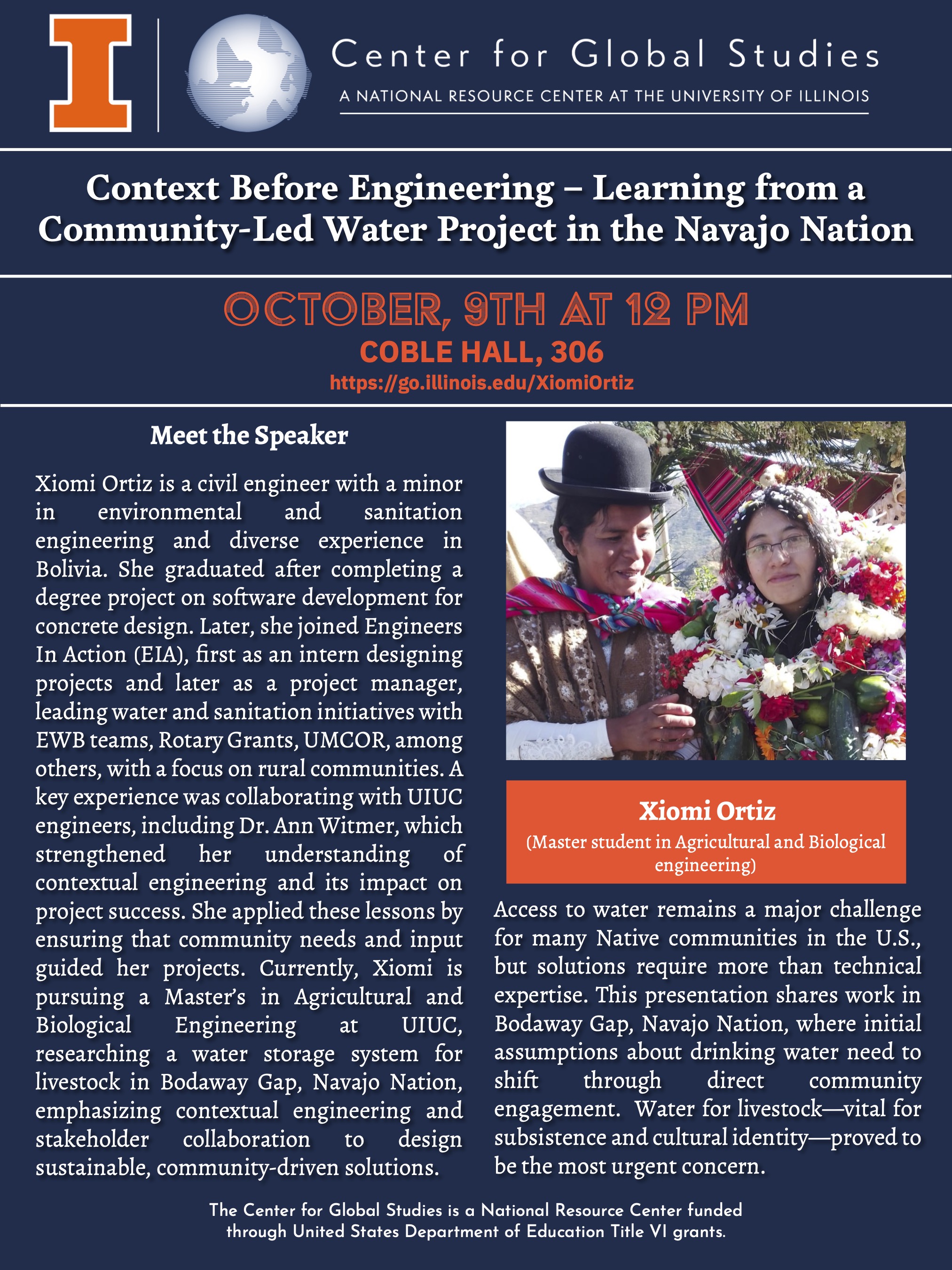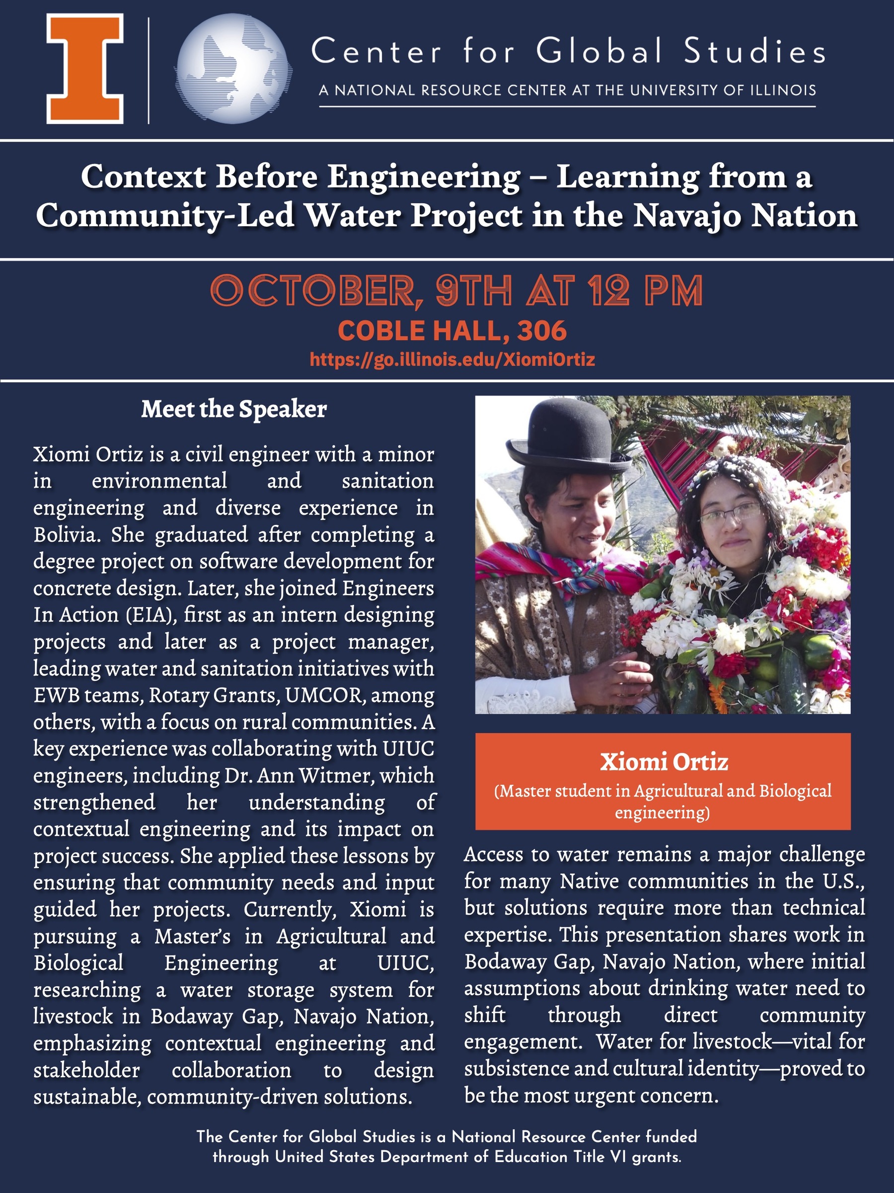 October 9 – Xiomara Ortiz (MA candidate, Agricultural and Biological Engineering, UIUC), "Context Before Engineering – Learning from a Community-Led Water Project in the Navajo Nation.”