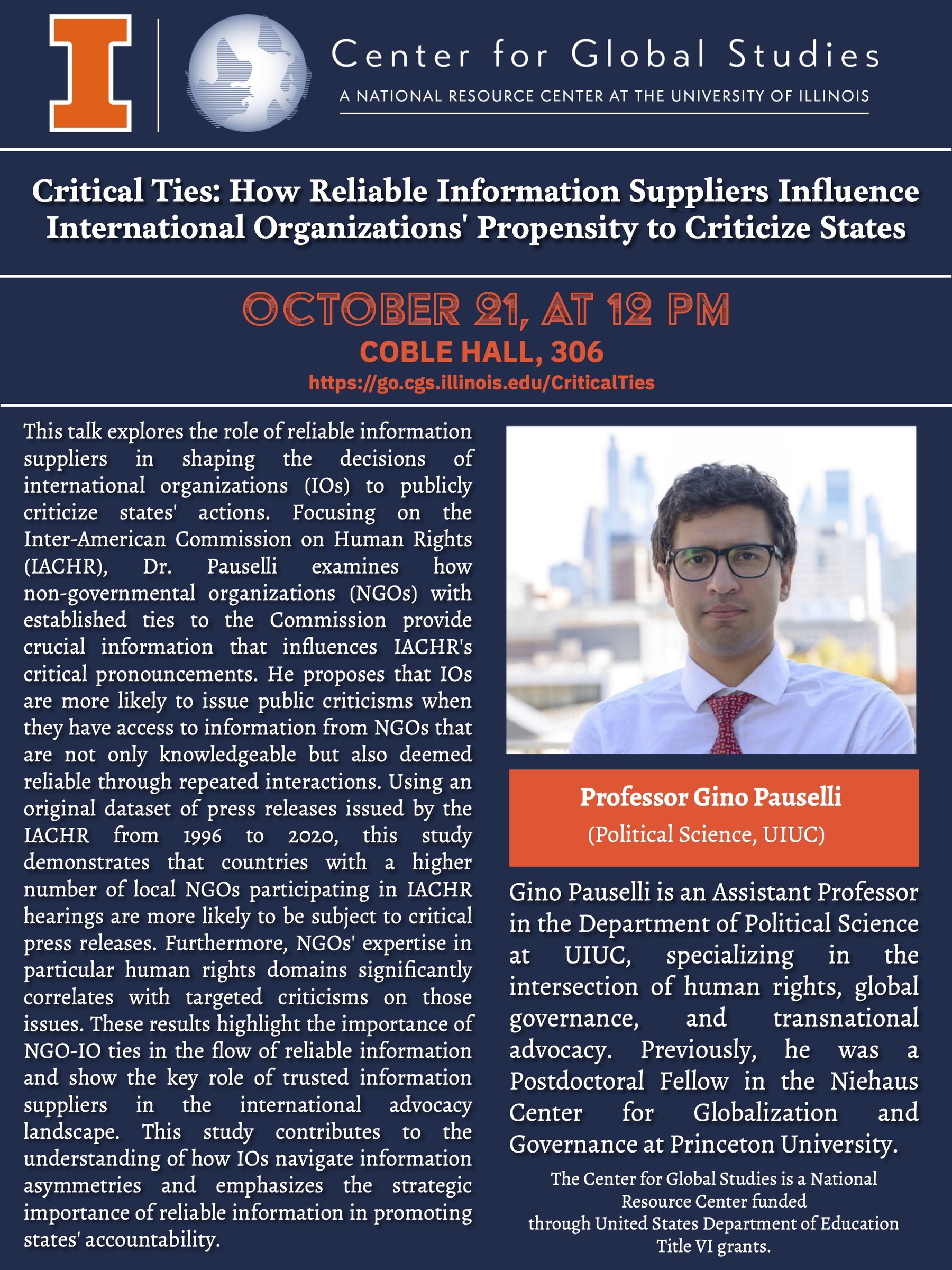 October 21 – Gino Pauselli (Political Science, UIUC), "Critical Ties: How Reliable Information Suppliers Influence International Organizations' Propensity to Criticize States."