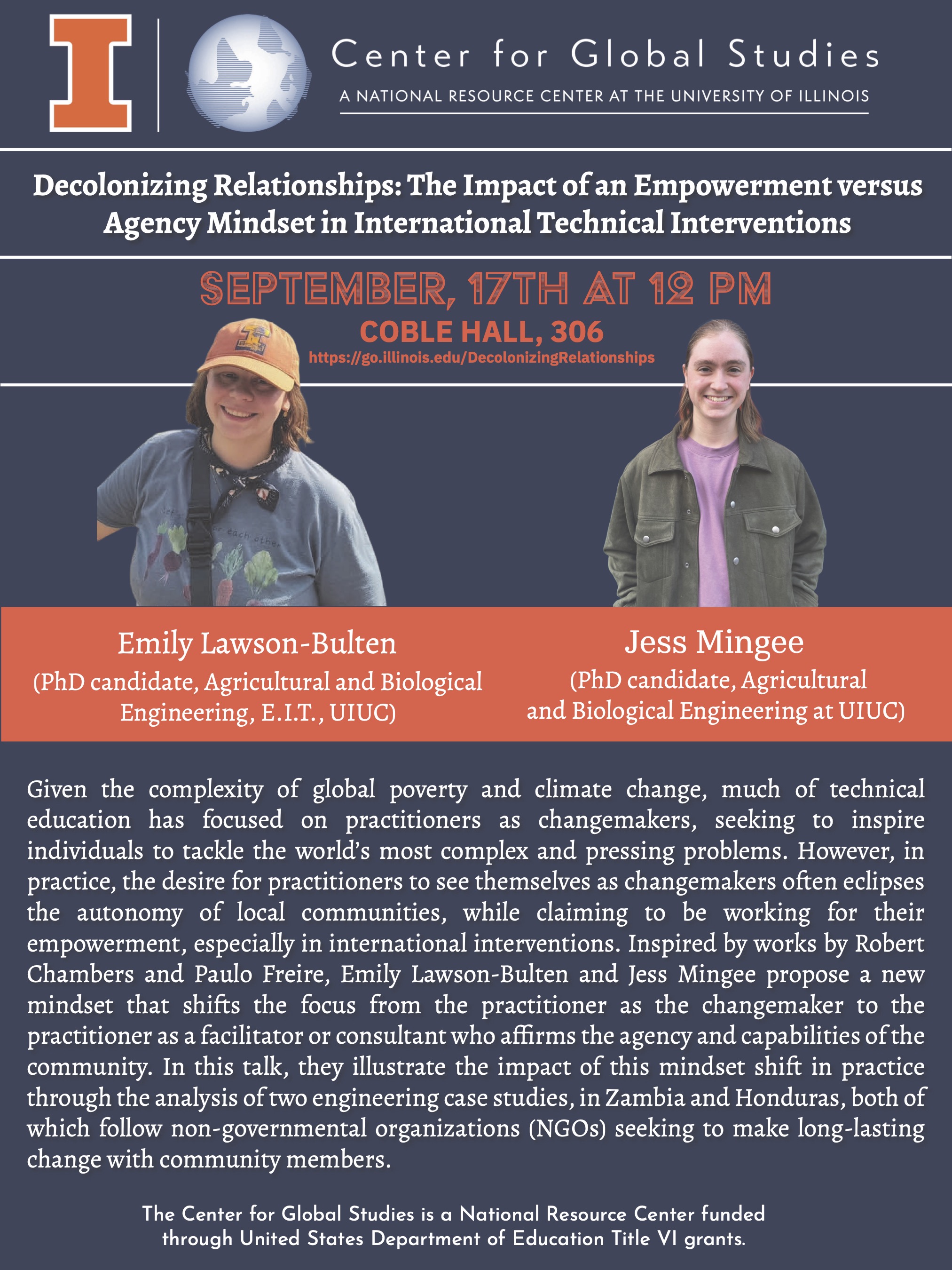 September 17 – Emily Lawson-Bulten and Jess Mingee (PhD candidates, UIUC), "Decolonizing Relationships: Moving from an Empowerment to Agency Mindset in International Engineering Interventions."