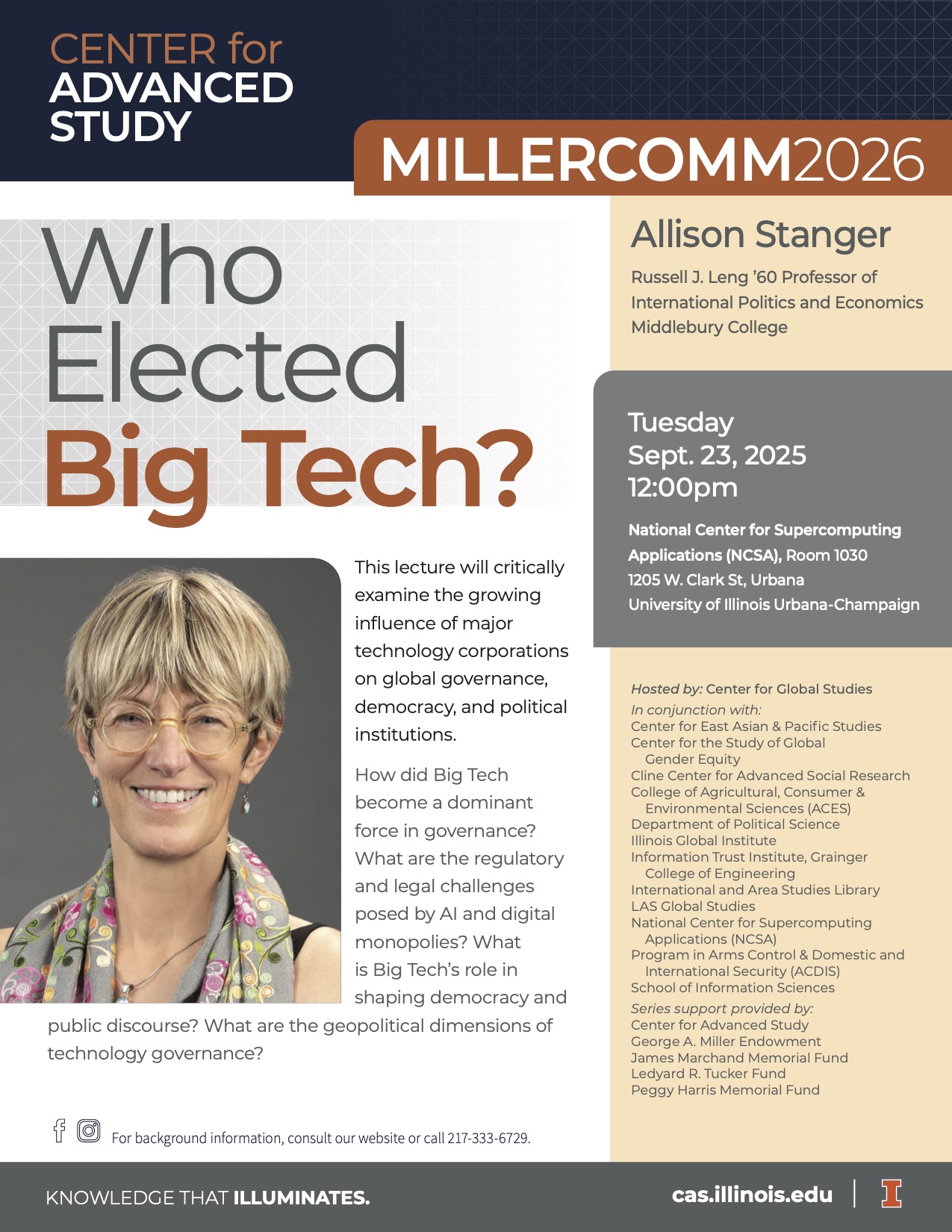 Together, these talks underscore the role of the Center for Global Studies as a critical hub for intersectional challenges, geographically expansive topics, and interdisciplinary dialogues at UIUC. By convening scholars, practitioners, organizations, and students working with power, governance, economy, technology, justice, and community insights, CGS continues to cultivate spaces for critical and transformative scholarship.