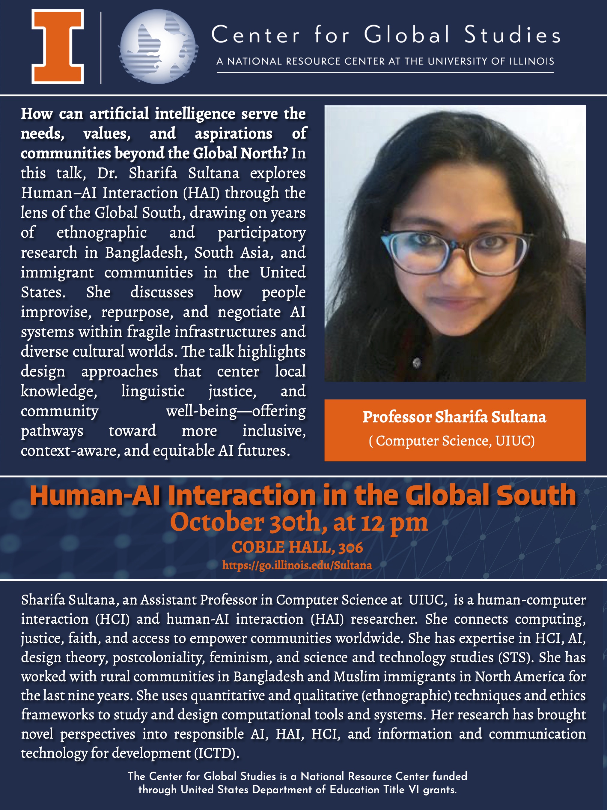 October 30 – Sharifa Sultana (Computer Science, UIUC), "Human-AI Interaction in the Global South."