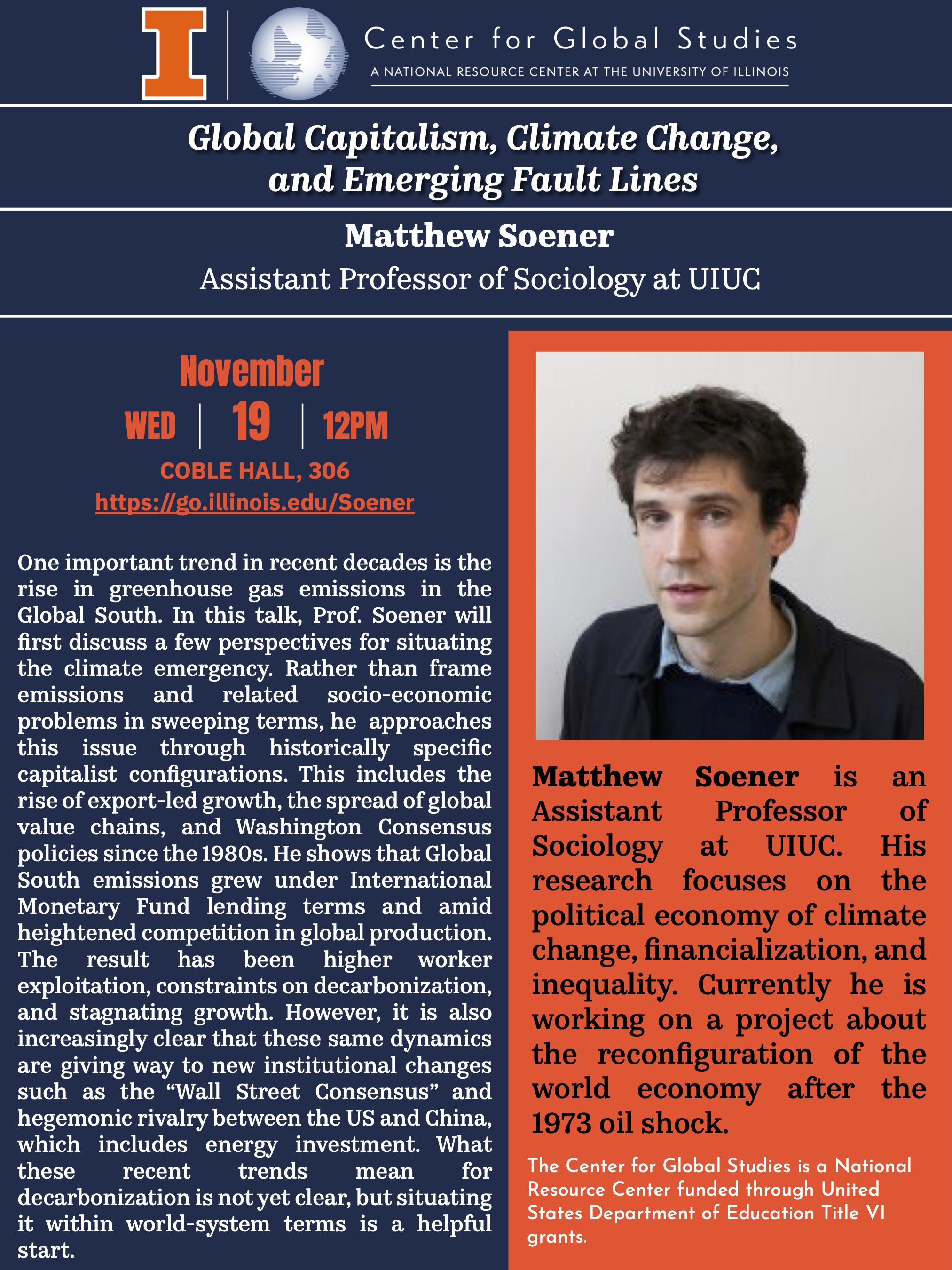 November 19 – Matthew Soener (Sociology, UIUC), "Global Capitalism, Climate Change, and Emerging Fault Lines."