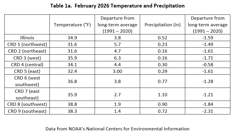 Precipitation statewide in February was 0.52 inches, 1.59 inches below the 1991-2020 statewide long-term average. February 2026 was the 4th driest February on record in Illinois