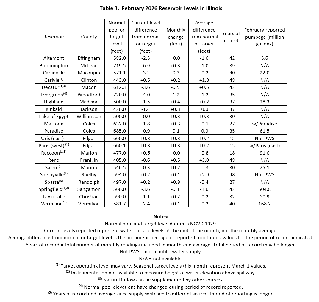 Water-Supply Lakes and Major Reservoirs. Table 3 lists selected reservoirs in Illinois, their normal pool or target water surface elevation, and data related to observed variations in water surface elevations. Reservoir levels are obtained from a network of cooperating reservoir operators who report water levels each month. Current reservoir levels reported in Table 3 are representative of the end of the reported month and are presented as the difference in feet from seasonal target level or from full pool, as applies. Years of record represent the number of past reports for the same month used to calculate the average of the month-end values presented in Table 3. For some reservoirs, this average does not include additional period of record prior to a substantial change in reservoir operation. Most reservoirs in Table 3 serve as public water supplies, with the exceptions noted in the last column.