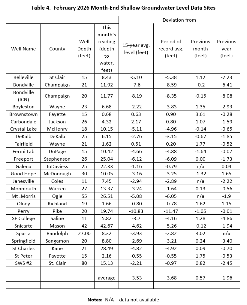 Wells averaged 1.96 feet below February 2025, 3.53 feet below the 15-year average, and 3.68 feet below the long-term record (Table 4).
