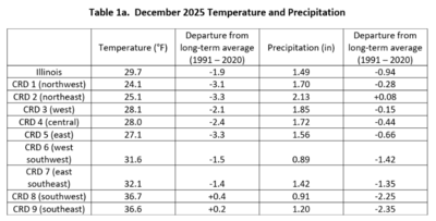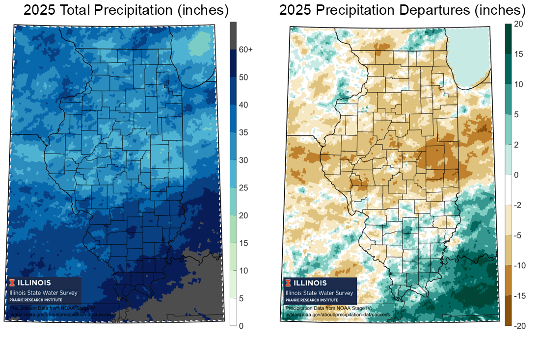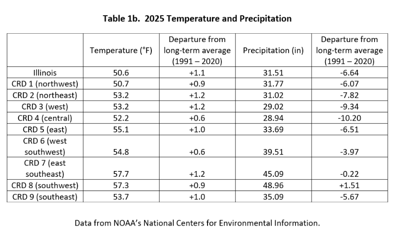 2025 Precipitation: Calendar year 2025 was very dry in Illinois, as all but 2 months last year were drier than normal. Only April and July were wetter than normal statewide. Some of the more extreme precipitation months included the 6th driest August on record statewide (1.74 inches), the 11th driest September on record (1.36 inches), and the 9th wettest July on record (6.23 inches).