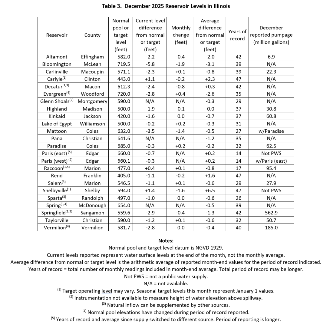Water-Supply Lakes and Major Reservoirs. Table 3 lists selected reservoirs in Illinois, their normal pool or target water surface elevation, and data related to observed variations in water surface elevations. Reservoir levels are obtained from a network of cooperating reservoir operators who report water levels each month. Current reservoir levels reported in Table 3 are representative of the end of the reported month and are presented as the difference in feet from seasonal target level or from full pool, as applies. Years of record represent the number of past reports for the same month used to calculate the average of the month-end values presented in Table 3. For some reservoirs, this average does not include additional period of record prior to a substantial change in reservoir operation. Most reservoirs in Table 3 serve as public water supplies, with the exceptions noted in the last column.