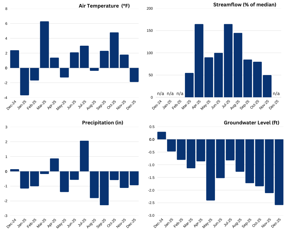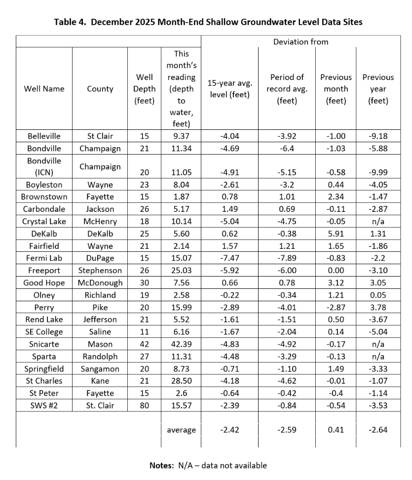 Wells averaged 2.64 feet below December 2024, 2.42 feet below the 15-year average, and 2.59 feet below the long-term record (Table 4). Water tables have averaged lower than the long-term record for every month of 2025.