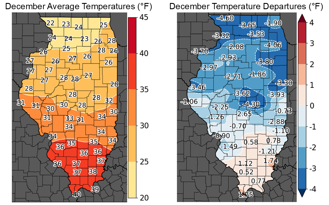 Overall, temperatures averaged 31.0°F, 13.0° cooler than November and 1.1° below the long-term average. The highest recorded temperature was 76.9° F, measured at ICN Belleville (St Clair County) on December 28. The lowest was -15.1° which was recorded at ICN Bondville (Champaign County) on December 14.
