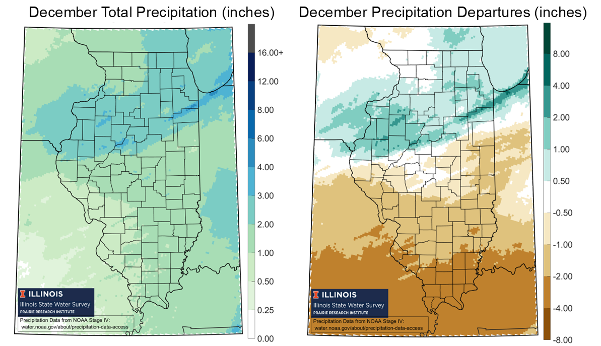 Precipitation: December reminded us of an important difference between total precipitation and total snowfall. Northern and central Illinois had higher than normal snowfall last month, with totals ranging from 3 to 20 inches. Parts of central Illinois received over 400% of normal December snowfall, including 15.5 inches in Fisher and 12.8 inches in Bloomington. However, one inch of snowfall in Illinois usually yields between 0.05 inches and 0.10 inches of liquid water, meaning that even the highest snowfall totals last month equated to only around 1 to 2 inches of liquid precipitation.