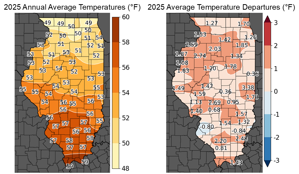 Average temperatures in Illinois last year ranged from the high 40s in northern Illinois to the high 50s in southern Illinois, between 1 and 3 degrees above normal (Figure 4). The year 2025 was the 15th warmest on record in Chicago, and the 20th warmest on record in Peoria. The warmest point in the state last year was Bean Ridge in Alexander County with an average temperature of 60.5 degrees. The coolest point in the state was Stockton in Jo Daviess County with an average temperature of 48 degrees.