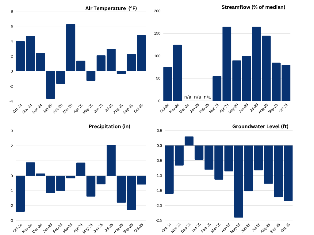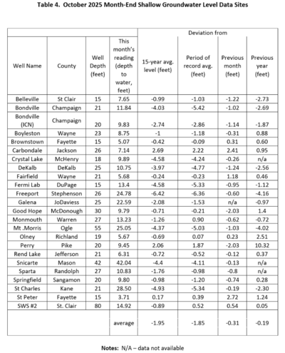 Wells averaged 0.19 feet below October 2024, 1.95 feet below the 15-year average, and 1.85 feet below the long-term record (Table 4).