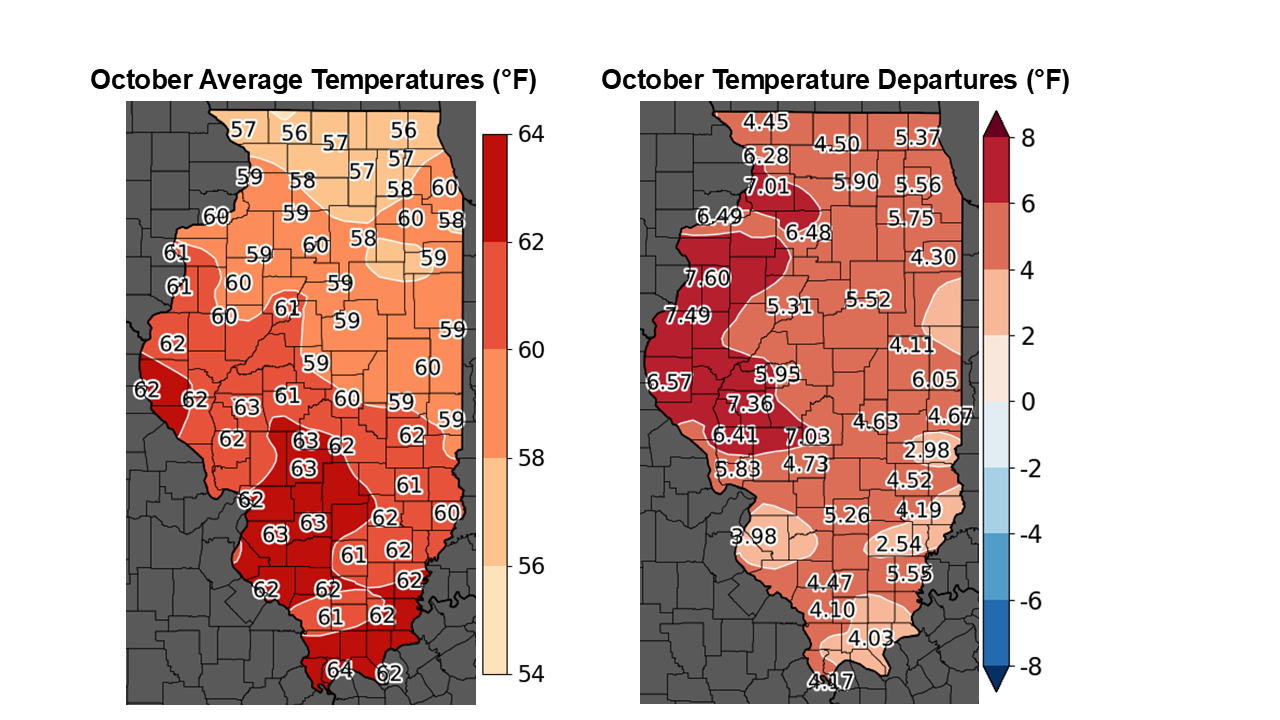 Temperatures average 58.9° for the month, 9.9° cooler than September and 4.1° warmer than the long-term average. Stations saw highs in the high 80s and low 90s and lows in the 20s and 30s. The highest recorded temperature was 92.5° at ICN Champaign (Champaign County) while the lowest was 25.8° at ICN DeKalb (DeKalb County).