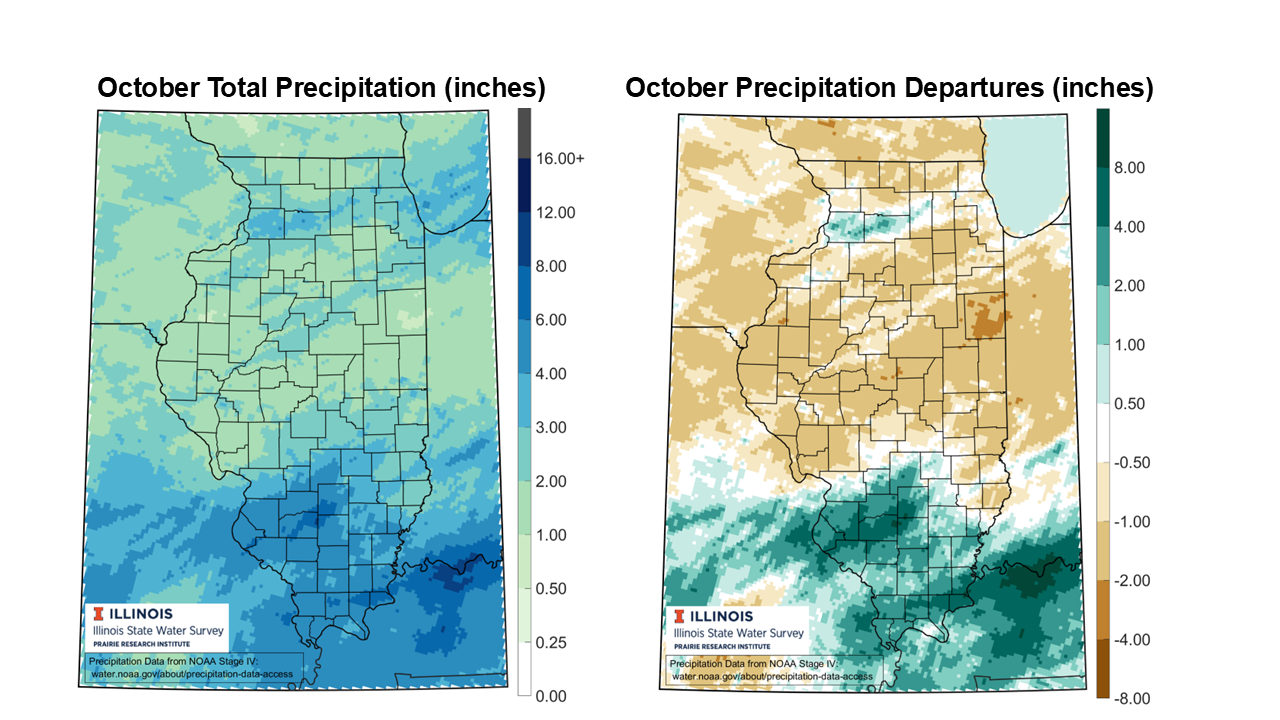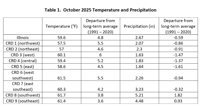 The first half of October was quite dry and extended drought conditions statewide from September. A significant weather pattern shift that coincided with the mid-month cooldown brought more frequent and substantial rain, especially in southern Illinois. Overall, October total precipitation ranged from around 0.90 inches in western Illinois to over 6 inches in parts of southern and south-central Illinois. Most of the state south of Interstate 70 was 1 to 4 inches wetter than normal in October, while most of central and northern Illinois were 1 to 3 inches drier than normal (Figure 3, Table 1).