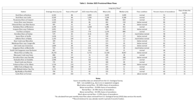 Provisional monthly mean flows for this month for 26 streamgaging stations located throughout Illinois are shown in Table 2, compared to statistics of past record of monthly mean flows at those stations for the same month. Both recent and long-term data are retrieved from USGS online data services following the end of the month. Years of record values in Table 2 represent the number of past monthly values included in the Table 2 statistics; at some stations, the available record may not be continuous. Additional source data may be available from USGS.