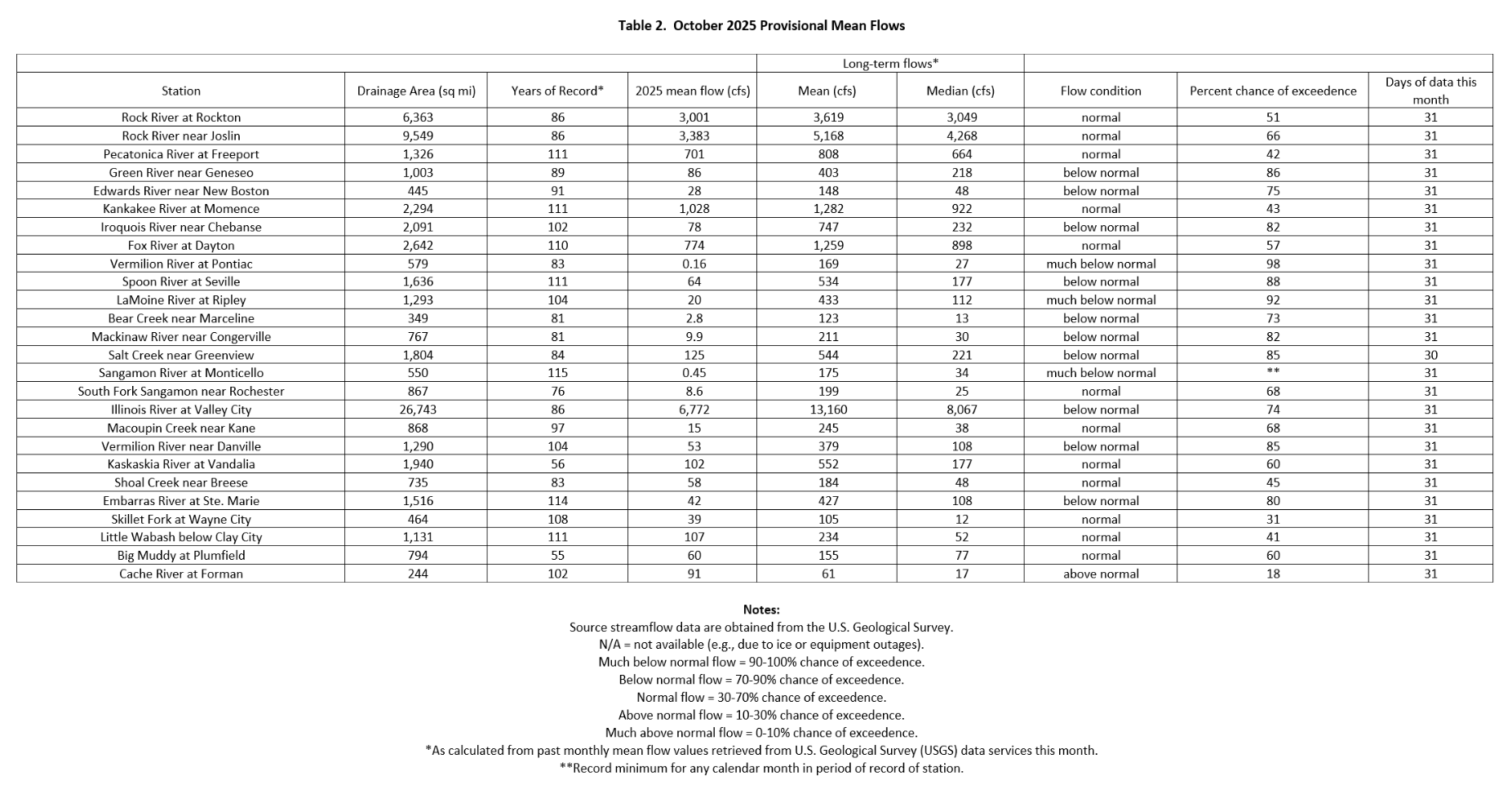 Mean provisional flow aggregated statewide, using the available monthly mean data shown this month in Table 2, was below the median value for October (approximately 80 percent of the median) and below the mean for October (approximately 35 percent of the mean). In October, monthly mean discharge values ranged mainly from normal to much below normal. The October 2025 monthly mean flows of the Vermilion River at Pontiac (which is downstream of the withdrawal intakes and impoundment for the Pontiac public water supply) and the Sangamon River at Monticello were near zero cfs. The October 2025 monthly mean flow of the Sangamon River at Monticello was the lowest reported for any calendar month in the period of record of the gage.