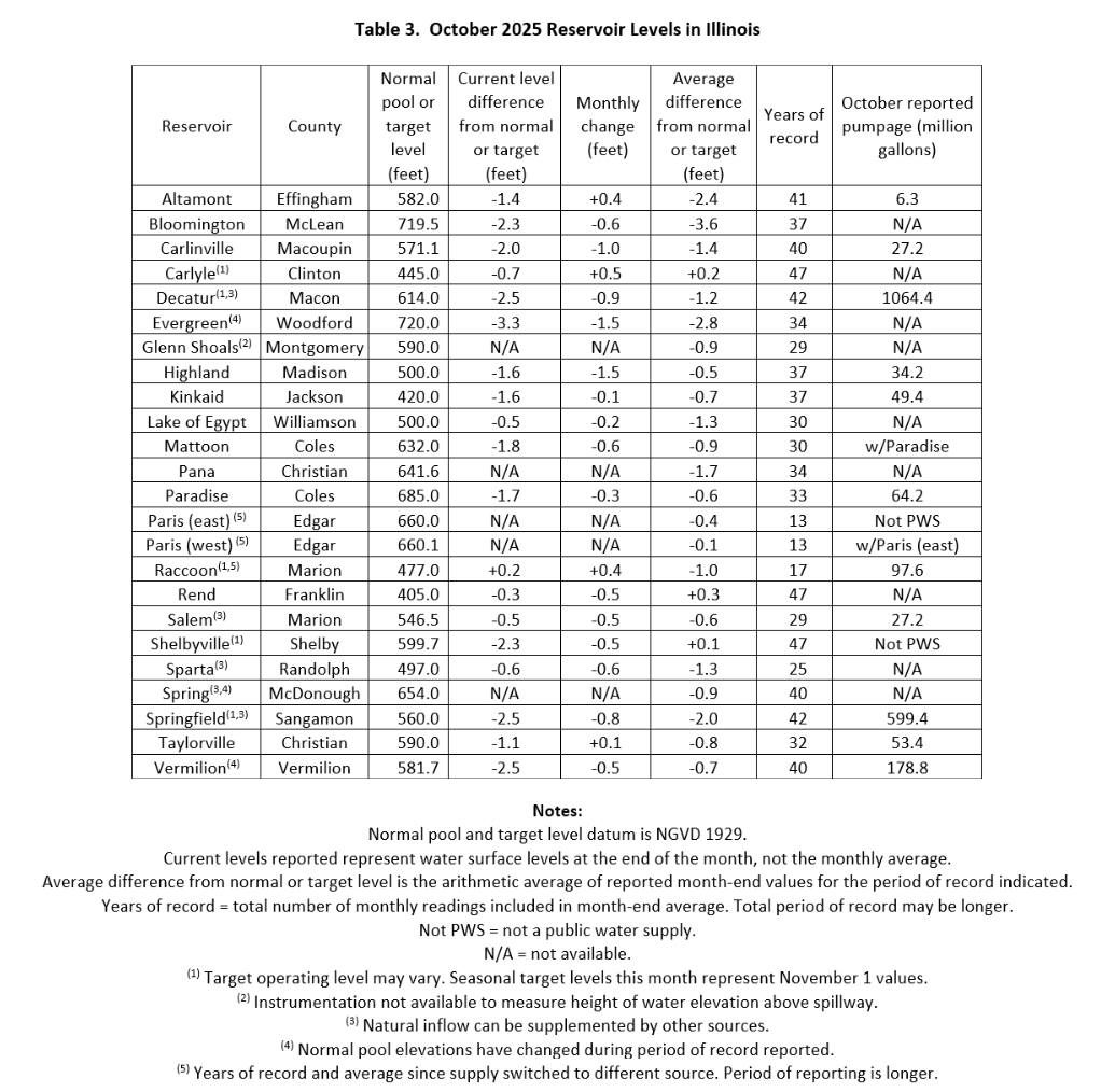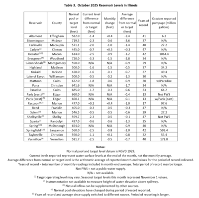 Water-Supply Lakes and Major Reservoirs. Table 3 lists selected reservoirs in Illinois, their normal pool or target water surface elevation, and data related to observed variations in water surface elevations. Reservoir levels are obtained from a network of cooperating reservoir operators who report water levels each month. Current reservoir levels reported in Table 3 are representative of the end of the reported month and are presented as the difference in feet from seasonal target level or from full pool, as applies. Years of record represent the number of past reports for the same month used to calculate the average of the month-end values presented in Table 3. For some reservoirs, this average does not include additional period of record prior to a substantial change in reservoir operation. Most reservoirs in Table 3 serve as public water supplies, with the exceptions noted in the last column.