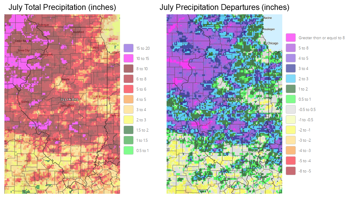The start of the growing season was dry in northern and parts of central Illinois. While the first half of July largely maintained that dry pattern, the second half of the month let loose and washed away drought concerns in much of Illinois. July total precipitation ranged from around 2.5 inches in southwest Illinois to nearly 15 inches in parts of western and south-central Illinois. Most of the state was 1 to 5 inches wetter than normal last month, while parts of east-central and southern Illinois were a bit closer to normal if not slightly drier than normal in July (Figure 3).