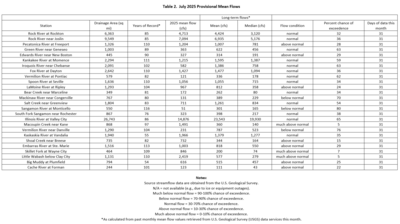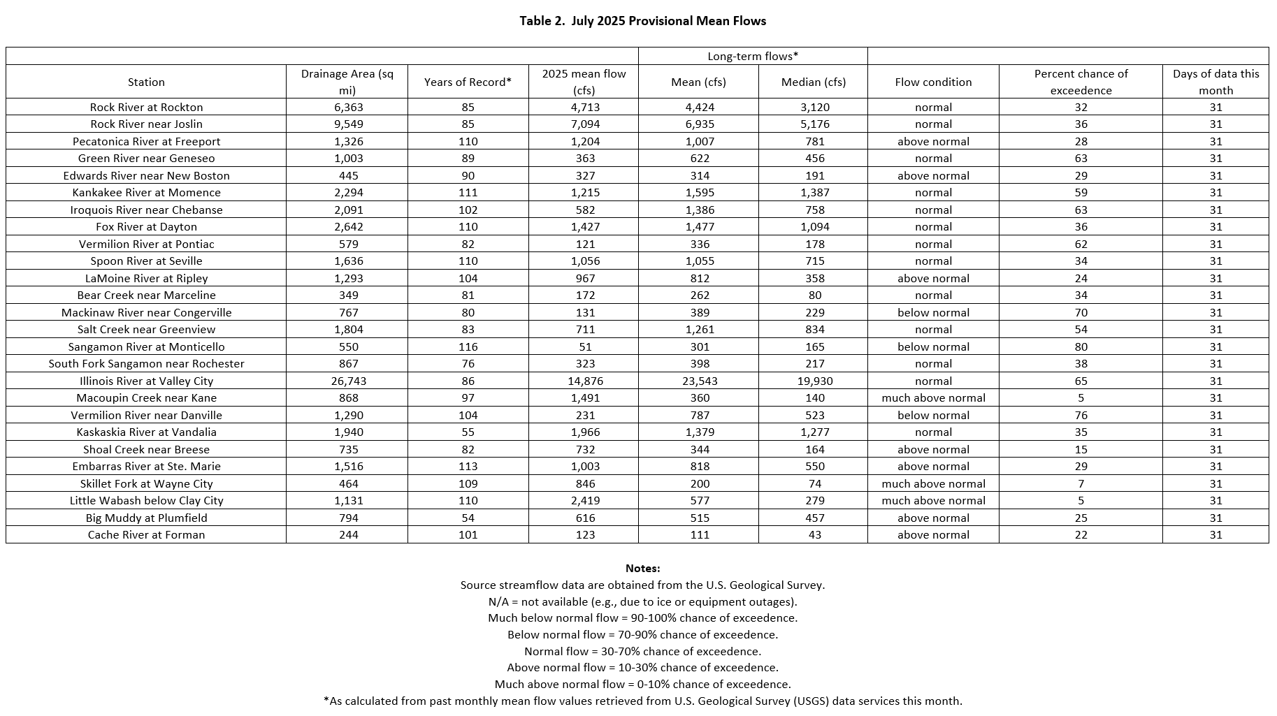 Provisional monthly mean flows for this month for 26 streamgaging stations located throughout Illinois are shown in Table 2, compared to statistics of past record of monthly mean flows at those stations for the same month. Both recent and long-term data are retrieved from USGS online data services following the end of the month. Years of record values in Table 2 represent the number of past monthly values included in the Table 2 statistics; at some stations, the available record may not be continuous. Additional source data may be available from USGS.