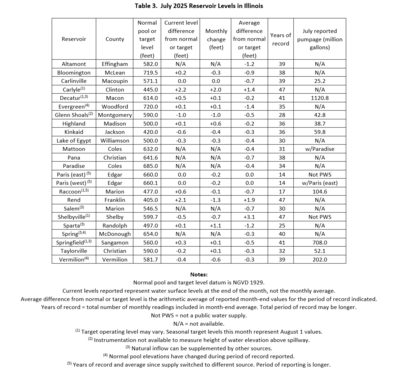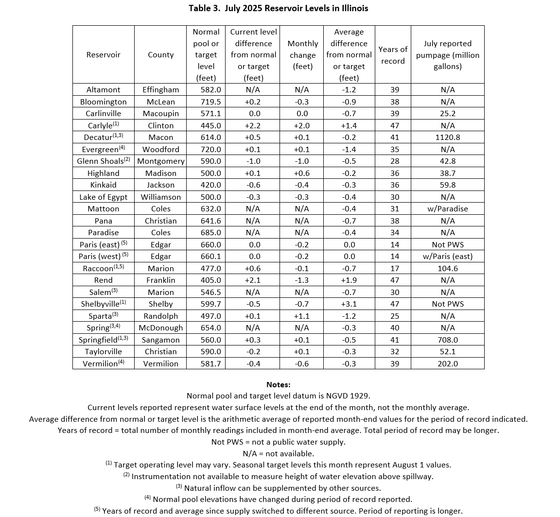 Water-Supply Lakes and Major Reservoirs. Table 3 lists selected reservoirs in Illinois, their normal pool or target water surface elevation, and data related to observed variations in water surface elevations. Reservoir levels are obtained from a network of cooperating reservoir operators who report water levels each month. Current reservoir levels reported in Table 3 are representative of the end of the reported month and are presented as the difference in feet from seasonal target level or from full pool, as applies. Years of record represent the number of past reports for the same month used to calculate the average of the month-end values presented in Table 3. For some reservoirs, this average does not include the additional period of record prior to a substantial change in reservoir operation. Most reservoirs in Table 3 serve as public water supplies, with the exceptions noted in the last column.