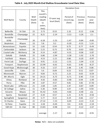 A wetter July at the Freeport well (Stephenson County) led to a slight increase (0.40 feet) in the well level that has been declining since July 2024. However, the increase in rainfall did not appear to affect the DeKalb well (Dekalb County) which was 2.94 feet lower at the end of the month and continued its four-month decline.