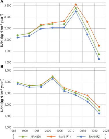 The study shows that high values of NANI in a watershed were associated with high values of flow-normalized riverine nitrate levels. Flow normalization statistically smooths out year-to-year variation in rainfall and river flow fluctuations and is a way of estimating the nitrate load if river flow was near the long-term average.