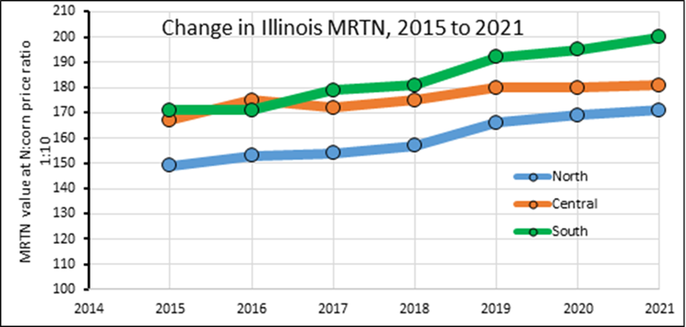 The Nitrogen Rate Trials program has been coordinated and managed by Illinois Fertilizer and Chemical Association in partnership with University of Illinois Urbana-Champaign and Illinois Nutrient Research & Education Council. Since 2014, partner producers have implemented nitrogen rate trials in their fields and adhered to University of Illinois trial protocols. Between 2014-22, 470 nitrogen rate trials were performed throughout Illinois. Data provided by the nitrogen rate trials was used to help update the nitrogen rate calculator, or Maximum Return to Nitrogen calculator, at cnrc.agron.iastate.edu, by using a regional approach developed by university soil fertility specialists for the corn belt states for developing corn nitrogen rate guidelines.